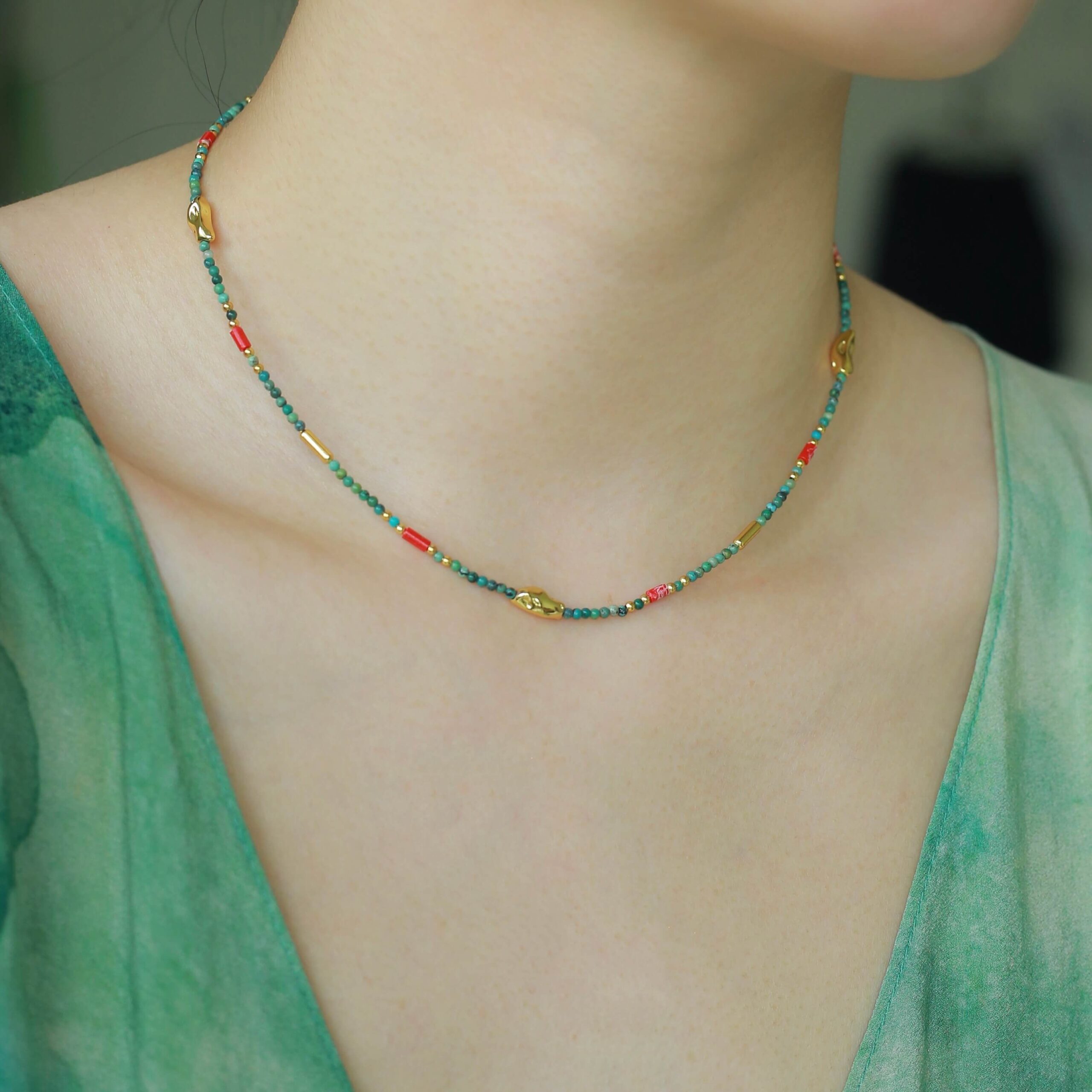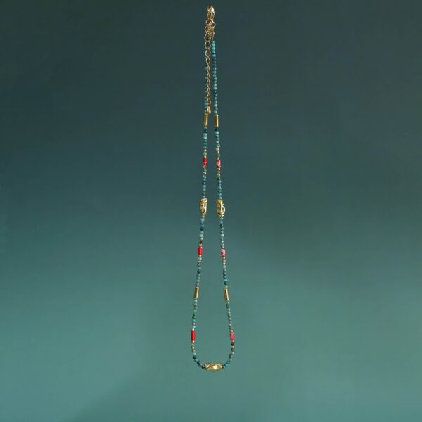 Featuring 2mm Hubei turquoise beads and irregular metal blocks, this piece blends raw beauty with the effortless elegance of bohemian spirit.