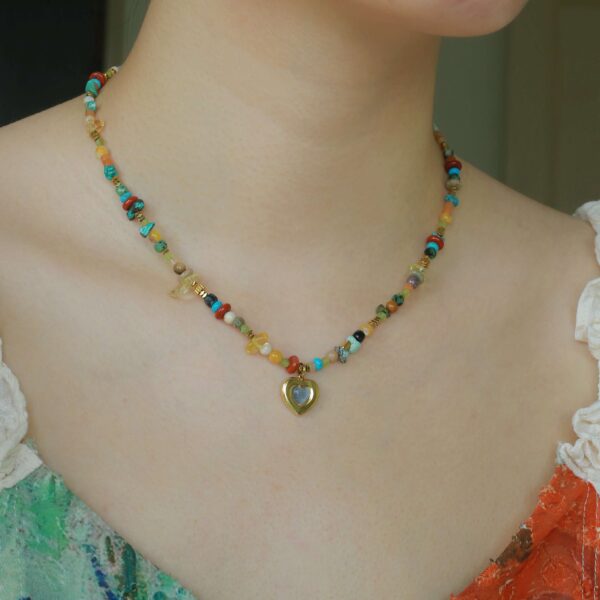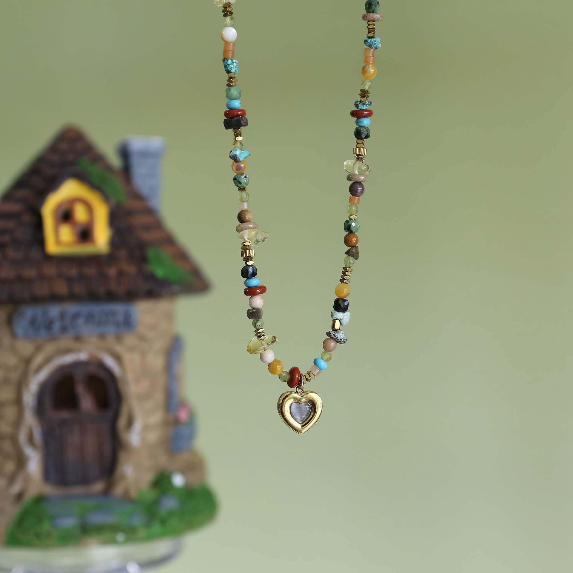 Shell, yellow stone, and African turquoise fragments encircle a golden heart—evoking rustic forest charm and carefree summer elegance.